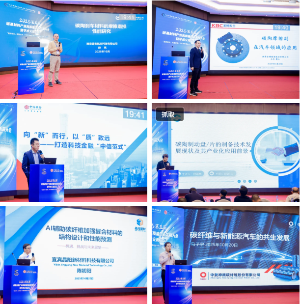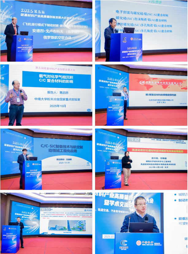 大会设置主题演讲、专题论坛、展位展示、企业参观等多项环节。紧扣全球绿色转型与科技创新趋势,聚焦航空航天、轨道交通、汽车等领域碳基材料产业发展,与会嘉宾来自俄罗斯航空联合体的安德烈·戈卢布科夫先生分享《飞机滑行模式下制动时碳-碳材料的摩擦特性研究》,系统分析了航空制动过程中材料的摩擦行为与性能演变;黄启忠教授深入解析《载气对化学气相沉积C/C复合材料的影响》;肖鹏教授探讨《碳陶制动技术在轨交车辆的应用实践与展望》;王华博士介绍了《碳陶摩擦副在汽车领域的应用》;陈初阳博士以《AI辅助碳碳/碳陶复合材料的高效结构设计与性能预测》为题,展示了人工智能在材料研发中的创新应用。涵盖以上专家在内,本次大会共有14位来自国内外的专家学者带来高水平报告,围绕碳基材料的前沿议题,从微观结构设计到宏观产业应用,多维度展示了最新研发成果与技术前景,彰显了产学研协同创新的强大动能。